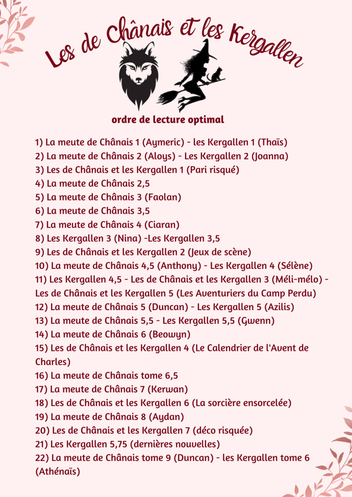 Les deux séries principales, les Kergallen et la Meute de Chânais, peuvent se lire indépendamment. Cependant, pour lire la série dérivée, il faut connaître les deux univers. Et pour un maximum de plaisir, voici l’ordre optimal de lecture de toutes ces aventures :
